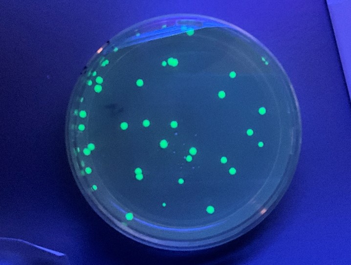 教科書で勉強した遺伝子組換えのしくみを、実際に実験する内容でした。1日目は大腸菌に遺伝子を導入し、培地の組成を変えたプレートに大腸菌を撒く作業を行いました。グループごとに、導入DNA(プラスミド)の量を変える条件と、導入方法であるヒートショックの時間を変える条件で実験を行いました。2日目は各培地の大腸菌のコロニー数を確認し、さらにGFPが取り込まれているかどうかを、UVランプを用いて確認しました。結果をグラフにまとめ、各班で考察発表を行いました。培地の組成が異なるとなぜ大腸菌の生育状況に変化があるのか、条件を変えたことでどのようなことが言えるのかを自分たちなりに相談しながら結論を導いていました。バイオテクノロジーに実際に触れる良い機会になりました。