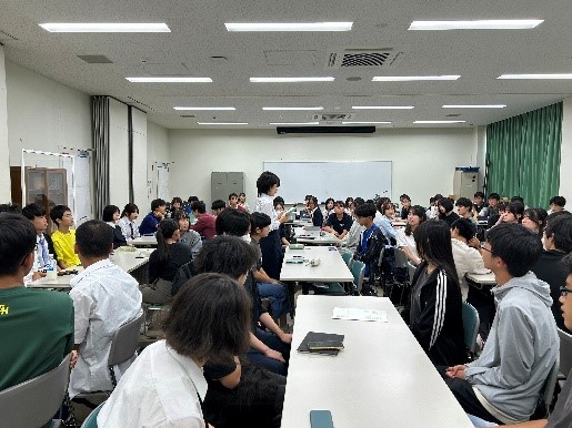 報告会では、各インタビュー班(11班)に分かれて、進み具合や研究者へのアポイントを取る際にうまくいったことやいかなかったことなどを伝え合いました。すでにインタビューを終えた班からは、「インタビューなので、一問一答というわけでなく、話題を膨らませることが大切だ」、「先生の研究分野に対する事前の学習が必要」といった、具体的なアドバイスがあり、これからインタビューを進める班は真剣に聞いていました。