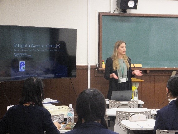 11月20日(木曜日)、国立研究開発法人理化学研究所から研究員のDr. Therese Sara KARMSTRANDをお招きして、英語での特別講義「光の正体は ―波か粒子か―? 干渉現象を通して1光子ずつ光を構築する」(Is Light a Wave or a Particle? Building Light One Photon at a Time Through Interference)を実施しました。