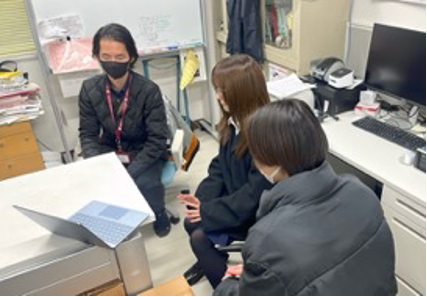 生徒たちは、これまで行ってきたタンパク質の定量実験やその考察について説明し、現在直面している課題について相談しました。大金先生からは、分子レベルでのアレルギー反応のメカニズムや、信頼性の高いデータを得るための測定法について専門的な視点からご指導をいただきました。先生からのご助言を受けて、実験手法を再検討し、追加実験の実施や検証に向けて、さらに意欲を高めています。